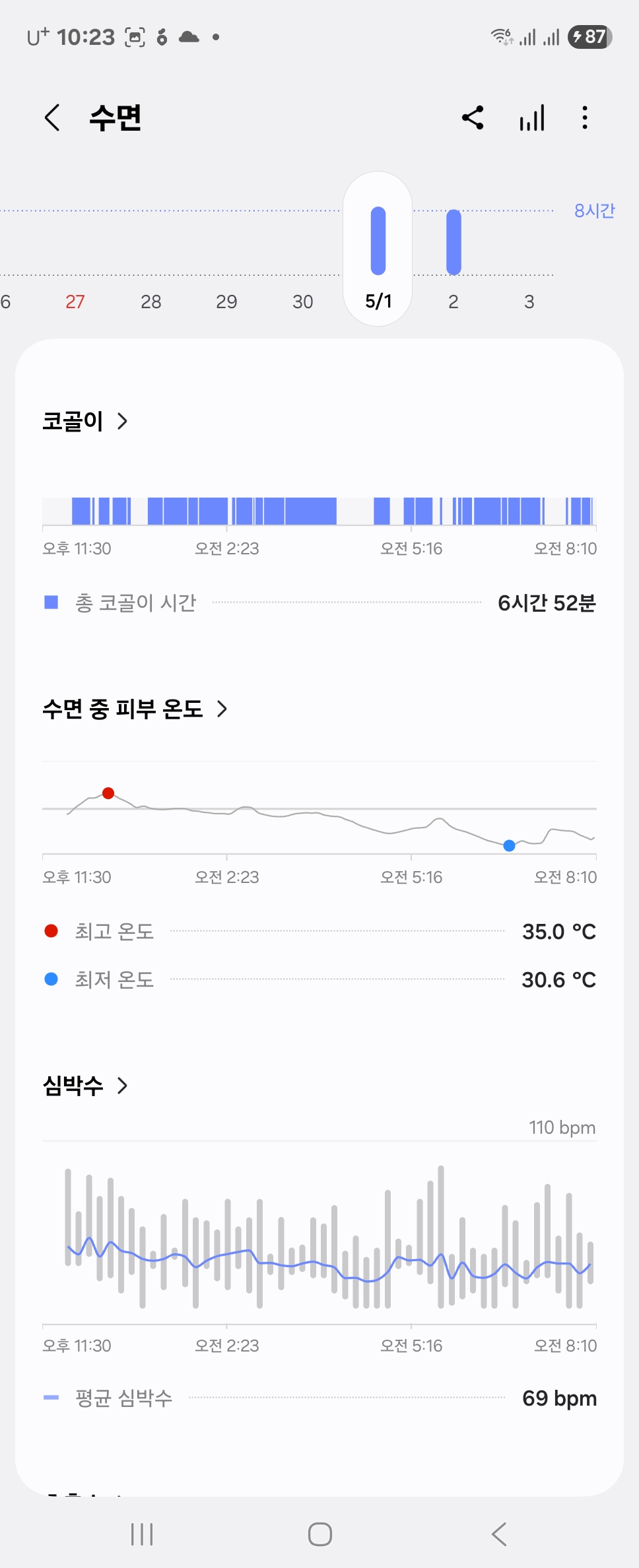 - 코골이 감지: 스마트폰 마이크와 연동 시 코골이 소리도 기록